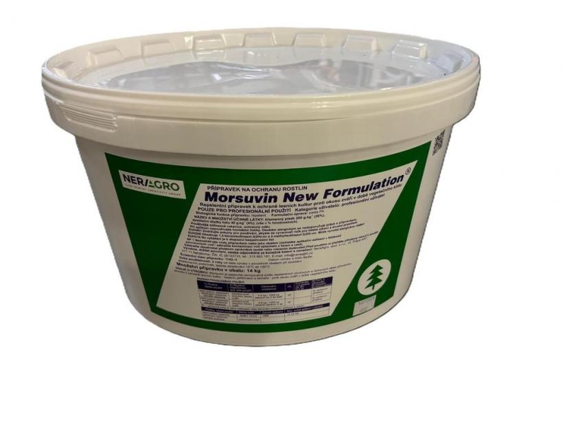 MORSUVIN NEW FORMULATION 14 kgMorsuvin je repelentní přípravek k ochraně lesních kultur proti okusu zvěří v době vegetačního klidu. Jedná se o pastovitou směs charakteristické chuti a zápachu s příměsí písku. Obsahuje směs repelentních chuťových a čichových látek s přísadou zubovrzu, vytvářející na sazenicích hrubozrnnou porézní ochrannou vrstvu. Odpuzuje zvěř pachem a mechanicky. Morsuvin je vodou ředitelný, po zaschnutí je již vodou nerozpustný. Přilnavost je zajištěna i na vlhké sazenice, aplikuje se nátěrem. Pro zvěř nenávykový.